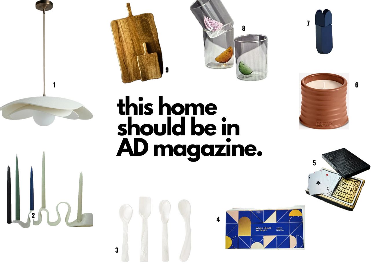 1. Lulu and Georgia x Lolly Lolly Ceramics - Soft Petal Pendant Light ($598) 2. Hawksins New York - Weylyn Candelabra ($160) 3. Gohad World - Off White Mother of Pearl Set [4 pcs] ($100) 4. Esther Perel - Where Should We Begin? ($40) 5. L'Objet - Crocodile Embossed Box with Playing Cards ($250) 6. Loewe - Small Juniper Berry Candle ($110) 7. Hay - Arcs stainless-steel salt and pepper grinder ($73) 8. Maison Balzac - 3 Citrus Goblets ($127) 9. Zara Home - Irregular Cutting Boards ($22.90 - $49.90)