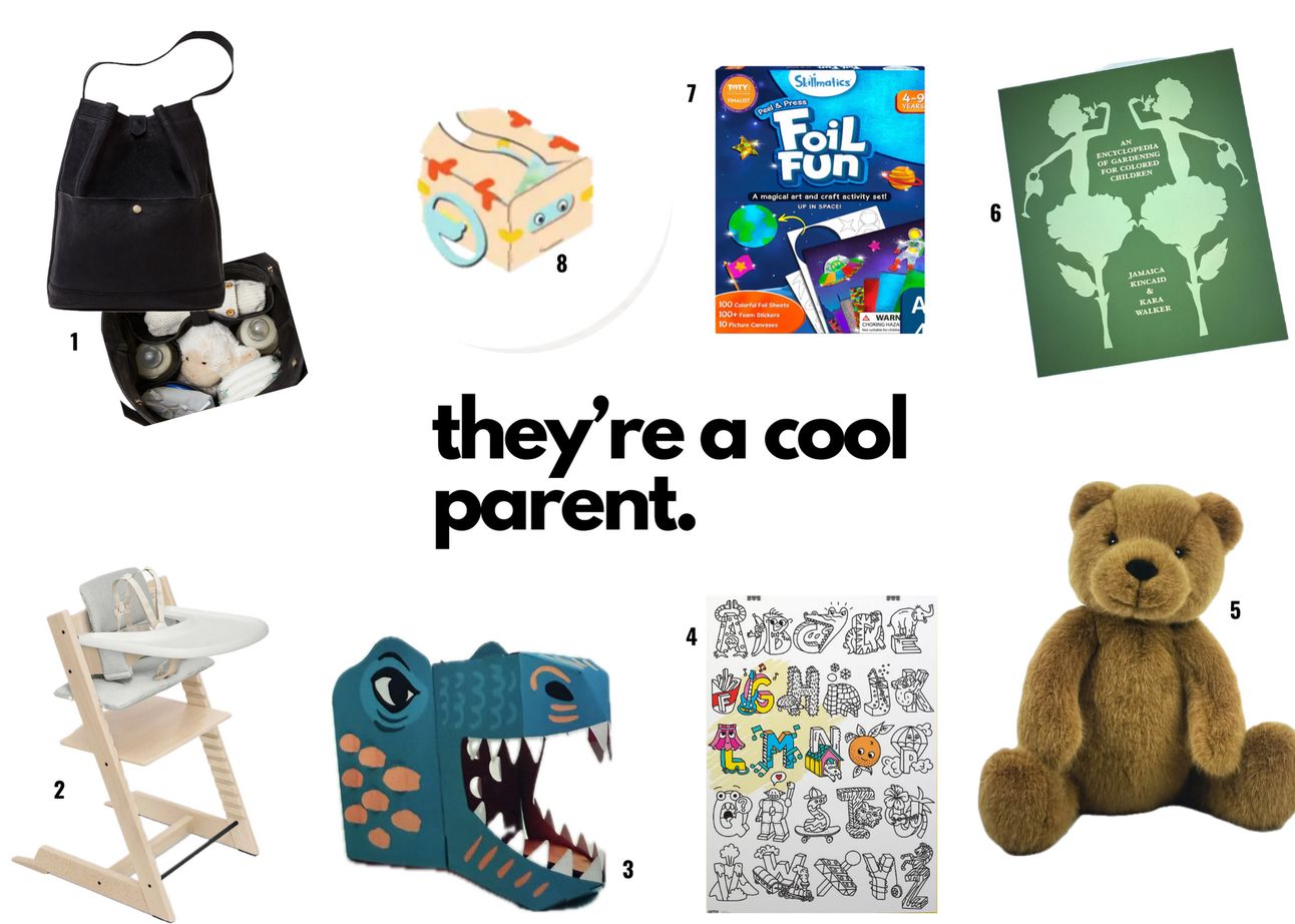 1.Josefina - Multi-Purpose Backpack in Black ($376) 2. Stokke - Tripp Trapp Chair (6 months to Adult) ($319) 3. Omy - Dino 3-D Mask ($29.99) 4.Omy - ABC Giant Poster ($19.50) 5. Jellycat - Maple Stuffed Bear ($28.50) 6. Jamaica Kincaid [Author] & Kara Walker [Illustrator] - An Encyclopedia of Gardening for Colored Children ($17.70) 7. Skillmatics - Foil Fun ($9.97 and up) 8. KiwiCo - KiwiCo STEM Clubs (Price Dependent on KiwiCo Club)