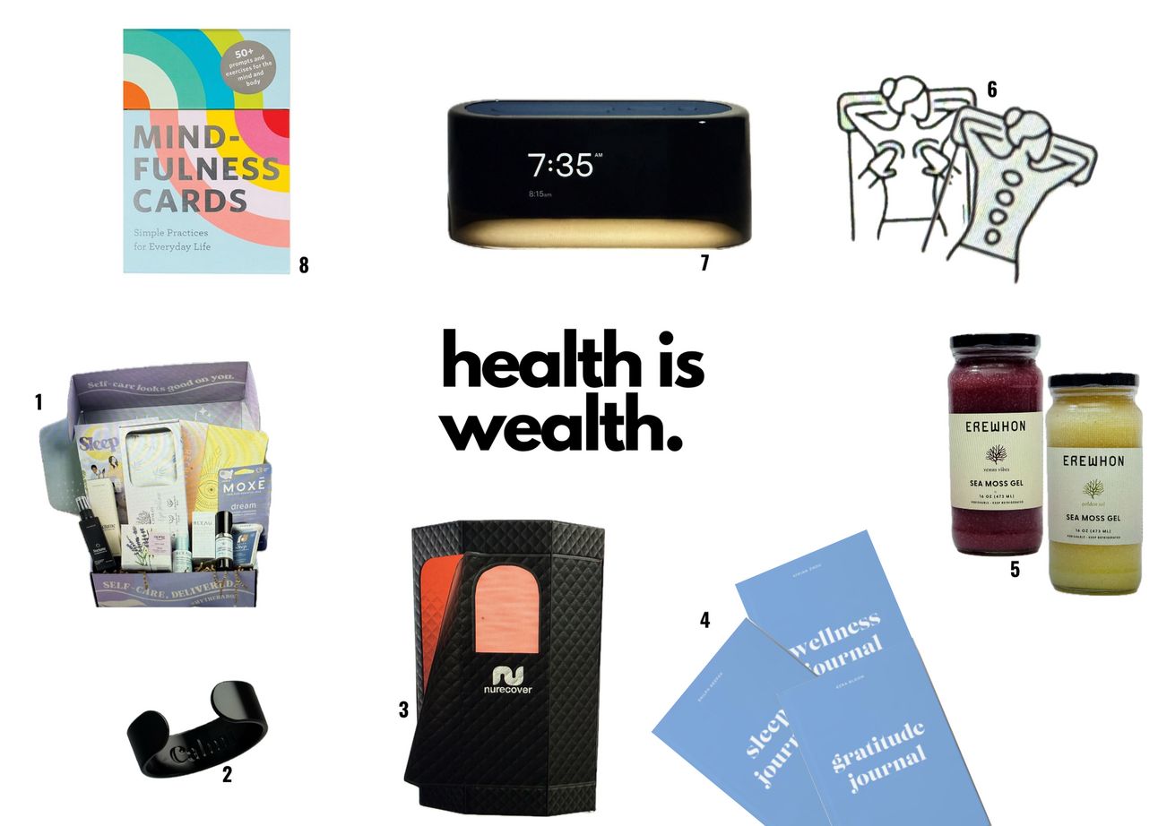 1. Therabox - Monthly Subscription Box ($39.99 per box) 2.Calmi - Calmi Ring [The Original] ($44.90) 3. nurecover -Tropic Home Steam Sauna ($345) 4. Joy - Journal [Gratitude, Wellness, or Sleep] ($29.75) 5. Erewhon - Sea Moss Gel [2 pack] ($88) 6. Wellness Treatment i,e, Massage, Accupuncture etc (Price Dependent on Location) 7. Loftie - Loftie Clock ($128) 8. Rohan Gunatillake - Mindfulness Cards ($13.58)