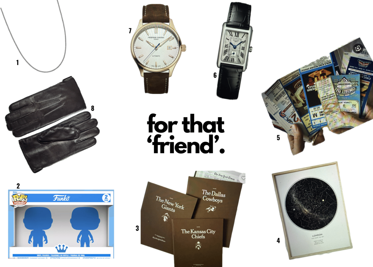 1. David Yurman - Unisex Chain ‘16 ($175) 2. Funko - Build Your Custom Pop [2 Pack] ($60) 3. New York Times -Custom Football Book ($90) 4. VelvetPrint - Custom Star Map ($11.90 and up) 5. Tickets to Sporting Event (Price Dependent on Location) 6. Longines - Dolce Vita Watch [Women’s - 20.8 × 32 mm]($1,425) 7. Frederique Constant - Classics Index Automatic [Men’s - 40 mm] ($1,495) 8. Aspinal of London - Cashmere Lined Leather Gloves [Men’s] ($115)