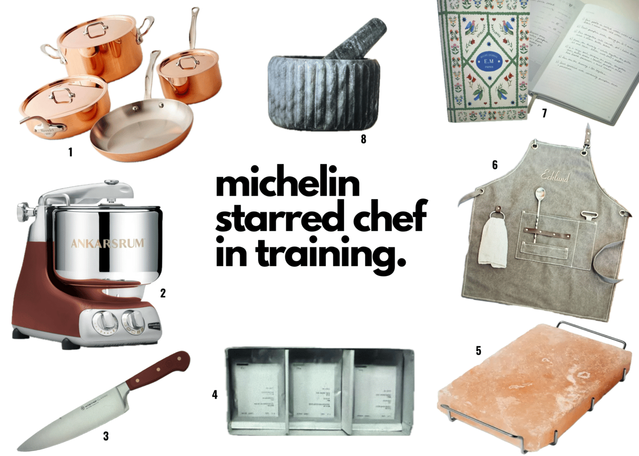 1. Mauviel - Tri-Ply M'3S Copper 7-Piece Cookware Set ($899.95) 2. Ankarsrum - Assistent Original in Rustic Maroon ($749.95) 3. Wüsthof - Classic 8’ Chef’s Knife ($170) 4. 7T+ - Loose Leaf Tea (Starting at ¥500) 5. Sur La Table - Himalayan Salt Block ($44.95) 6.JoyfulTidingsBridal - Personalized Canvas Workshop Apron ($29.96) 7. Quilted Daydreams - Recipe Journal ($32.30) 8. Anthropologie - Marble Mortar and Pestle Set ($32)