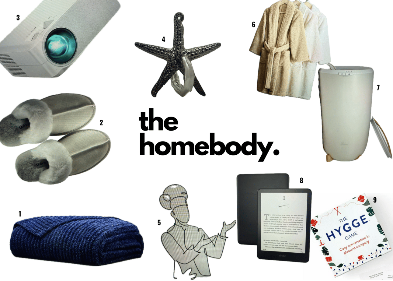 1. Luxome - Ultra Plush Throw ($110) 2. Quine - Australian Shearling Scuff Slipper ($49.90) 3. Vankyo - Wireless Single LCD Projector ($179.99) 4. Hanayama Puzzles - Various ($12.99 and up) 5. Cozymeal - Private Chef (Starting at $49) 6. Pottery Barn - Cozy Comfort Robe ($39.50) 7. Zadro - Ultra Large Luxury Towel Warmer ($134.99) 8. Amazon - Kindle Paperweight ($134.99) 9. The Hygge Conversation Game ($20)