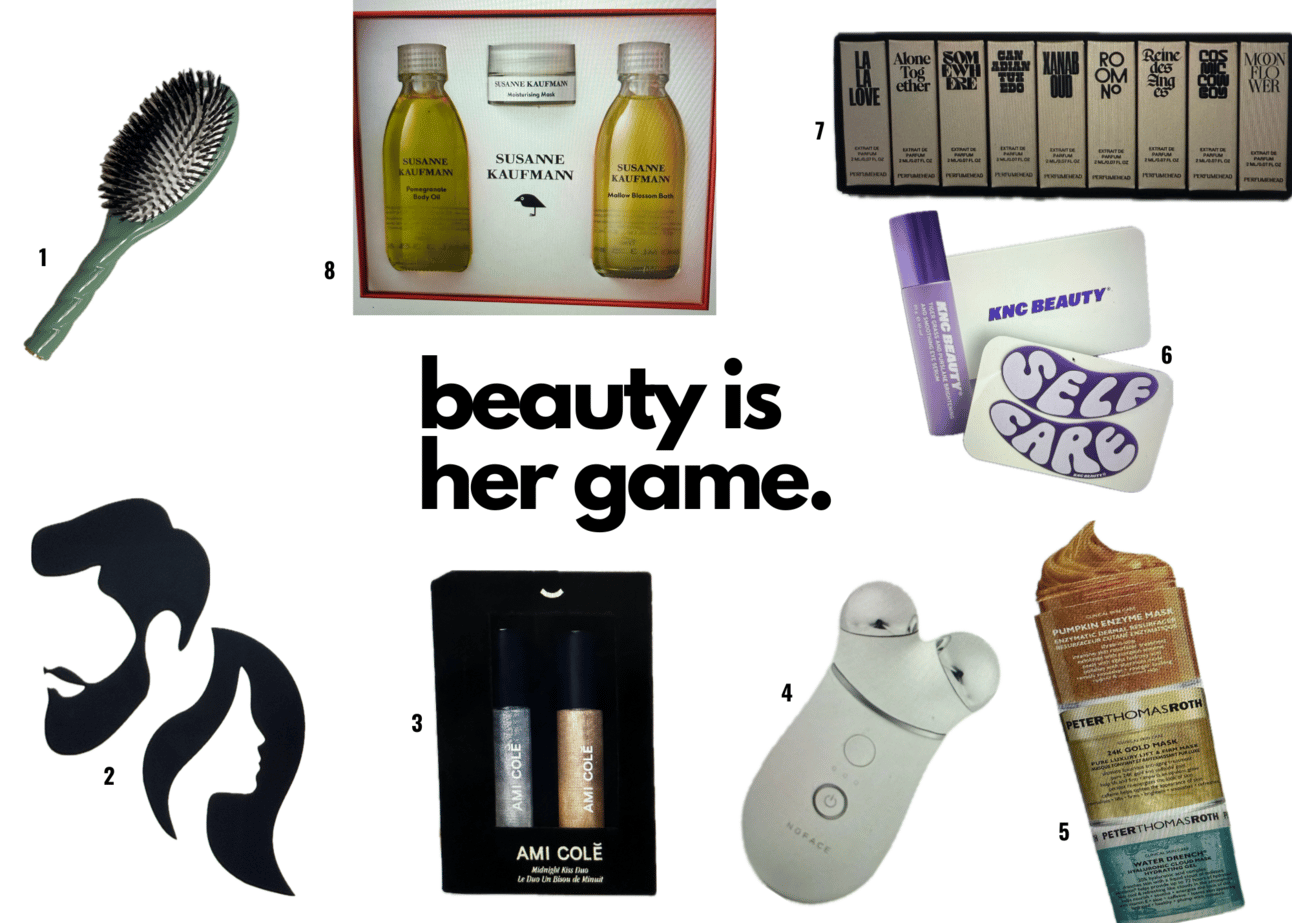 1. La Bonne Brosse - N.01 The Shine & Care Hair Brush THE UNIVERSAL ($168) 2. Pay for Beauty Treatment(s) i.e. Facial, Haircut, etc - (Price Dependent on Location) 3. Ami Colě - Midnight Kiss Duo ($35) 4. Nūface - TRINITY+ Value Starter Kit ($265) 5. Peter Thomas Roth - Mask Blast-Off 3-Piece Mask Kit ($36) 6. KNC Beauty - Reusable Self Care Bundle ($38) 7. Perfumehead - The Melrose Place Edit Discovery Set ($80) 8. Susanne Kaufmann - Home Spa Experience ($65)