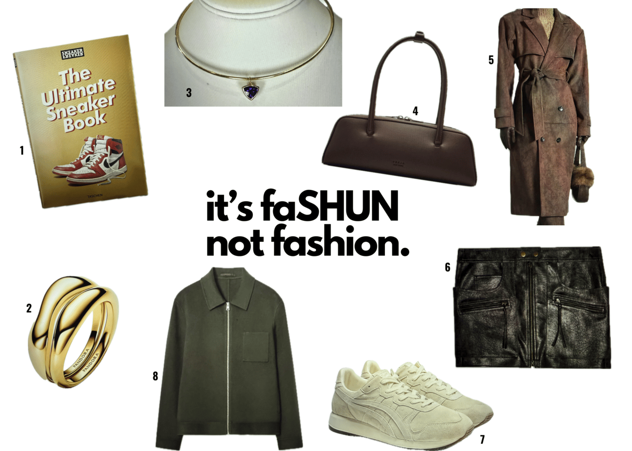 1. Taschen - Sneaker Freaker. The Ultimate Sneaker Book ($60) 2. Pandora - Organically Shaped Stacking Rings ($165) 3. Worship Gaud - 14K Amethyst Trillion Pendant ($400) 4. Fréja New York - Mercer Bag in Espresso ($298) 5. Manière De Voir - Suede Trench Coat in Brown ($405) 6. Isabel Marant - Claudine Skirt ($490) 7. Onitsuka Tiger - Tiger Alliance A40 Unisex ($200) 8. Cos - Double Face Wool Harrington Jacket [Men’s]($190)