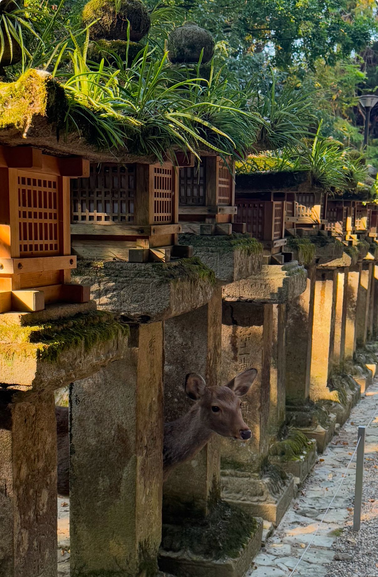 Deer from Nara Deer Park hanging out near lanterns within t a temple (I don’t remember which one, sorry!)