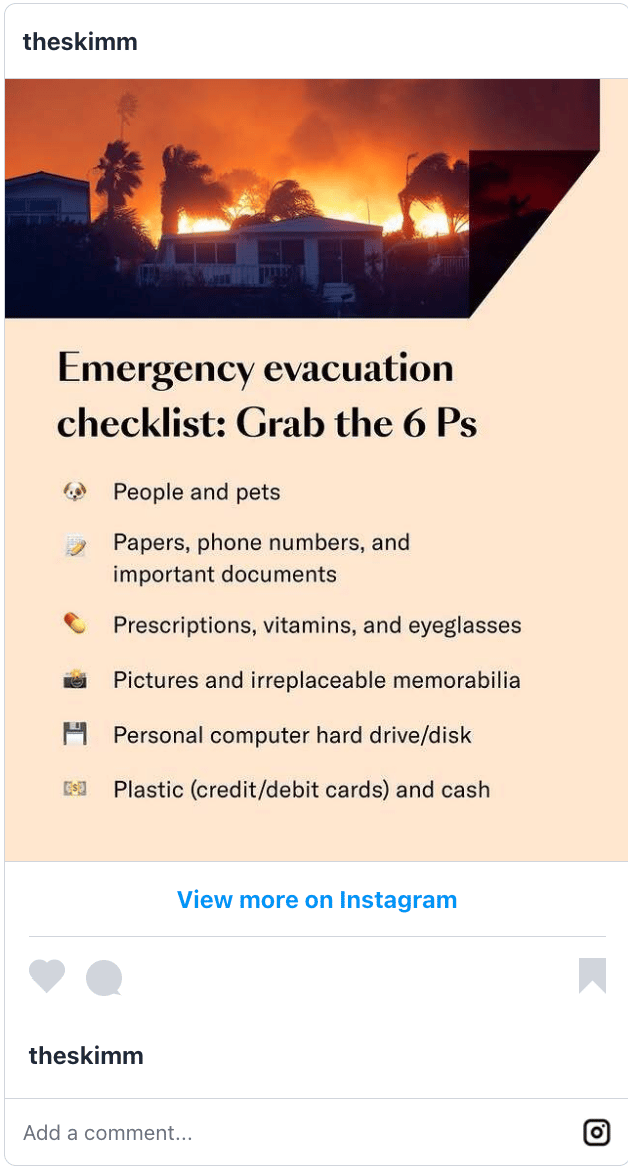Please forward this to anyone you think it might be helpful to no matter where they are in the world. Whether it’s a refresh, or starting the journey of being prepared for an emergency evacuation. It’s better to be prepared because no matter who you are, your mind goes blank and so many emotions flood in at once when you’re put in those types of situations.