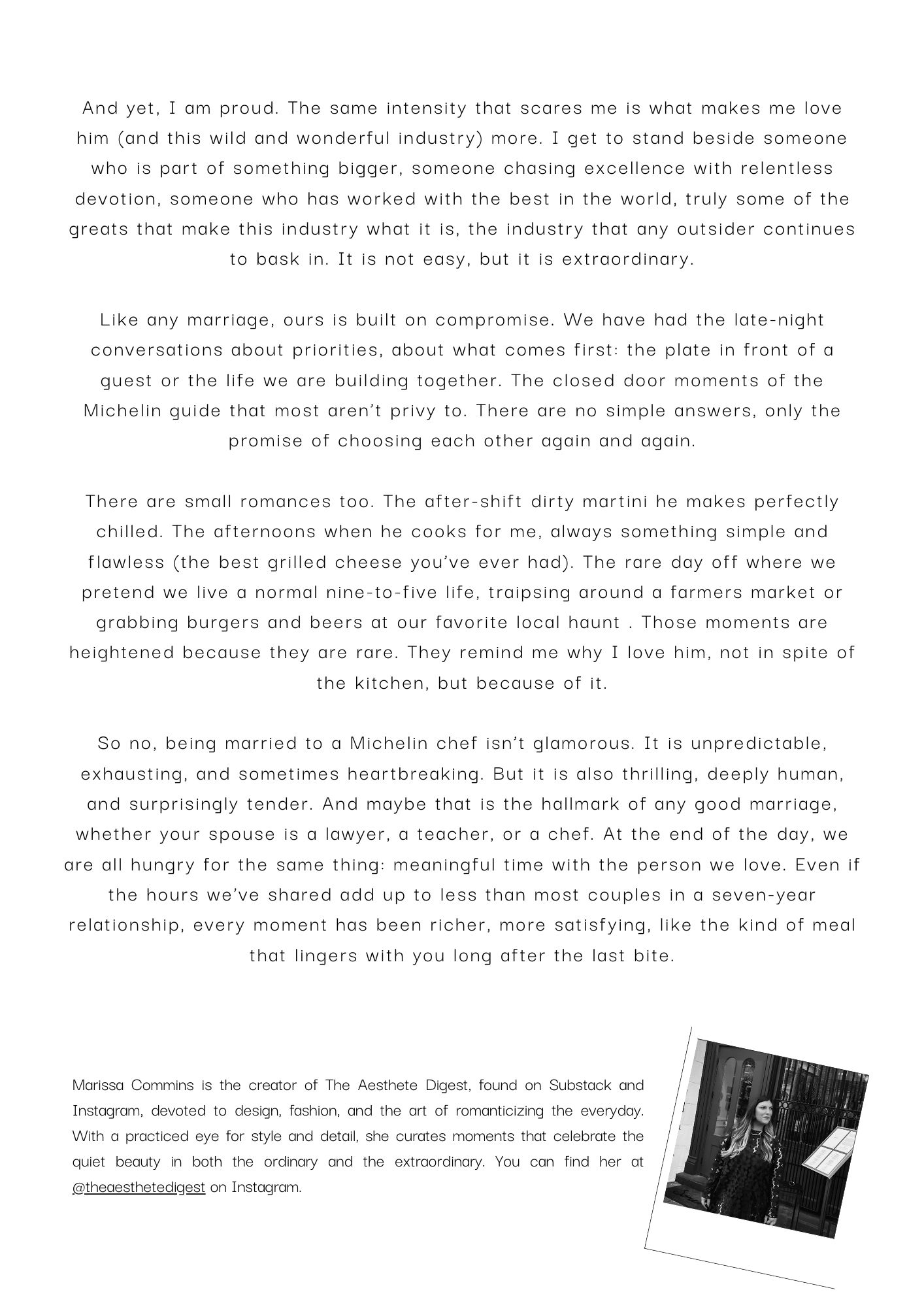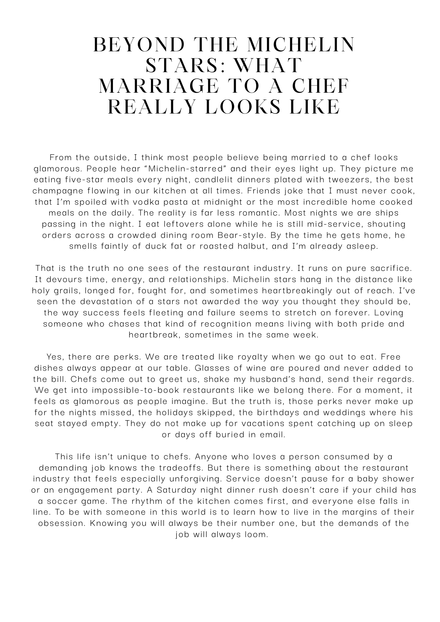Many of the people subscribed to this newsletter and myself included enjoy going to a Michelin recognized restaurant whether it’s Starred or Bib Gourmand. We often forget that the people creating that magic have lives of their own which brings us to this month’s guest columnist Marissa whose husband is a Michelin-starred chef.
