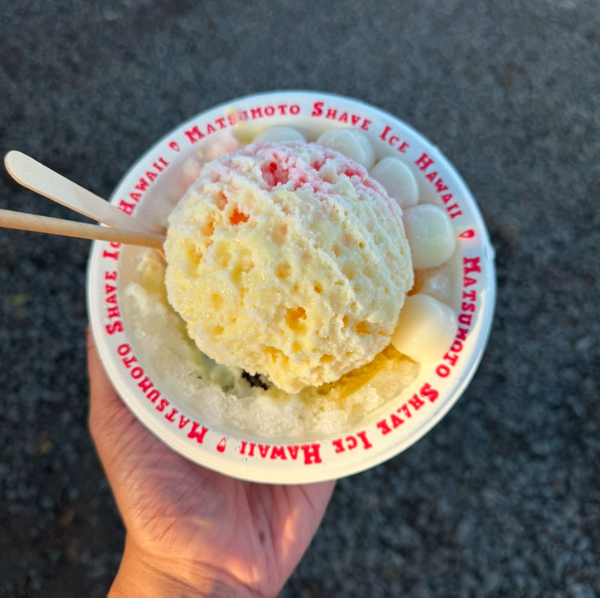 My shaved ice order —lilikoi, lycee and ume with condensed milk, mochi and azuki beans